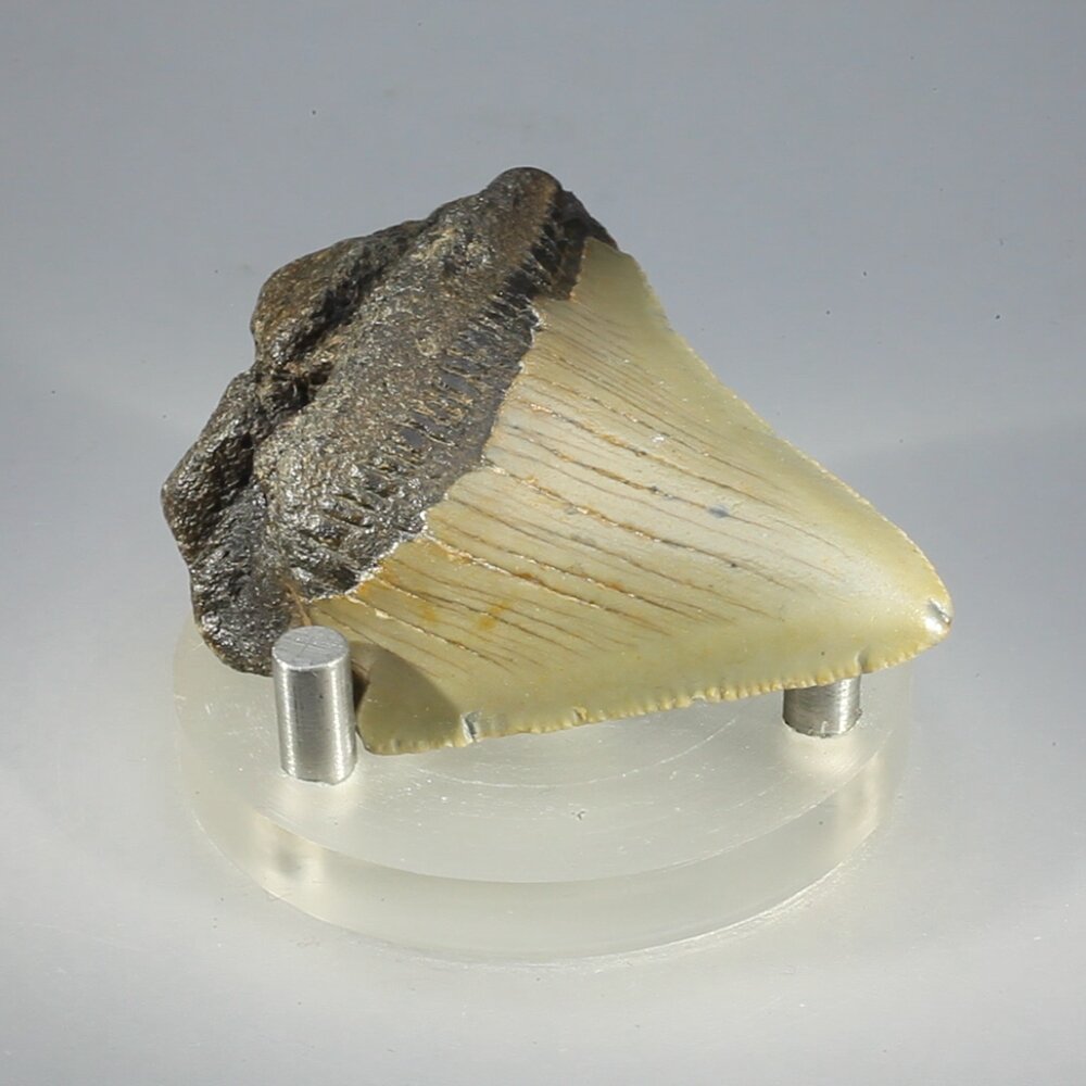 Megalodon teeth can be identified by their more regular triangular shape, robust structure, large size, fine edge serrations (not always visible on fossil remains), a lack of lateral denticles (side crowns), and the presence of a bourlette (the darker, chevron-shaped region near the tooth’s root). The largest Megalodon tooth found to date measures 7.1 inches on the diagonal, three times longer than any modern White Shark tooth!