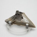 Megalodon teeth can be identified by their more regular triangular shape, robust structure, large size, fine edge serrations (not always visible on fossil remains), a lack of lateral denticles (side crowns), and the presence of a bourlette (the darker, chevron-shaped region near the tooth’s root). The largest Megalodon tooth found to date measures 7.1 inches on the diagonal, three times longer than any modern White Shark tooth!
