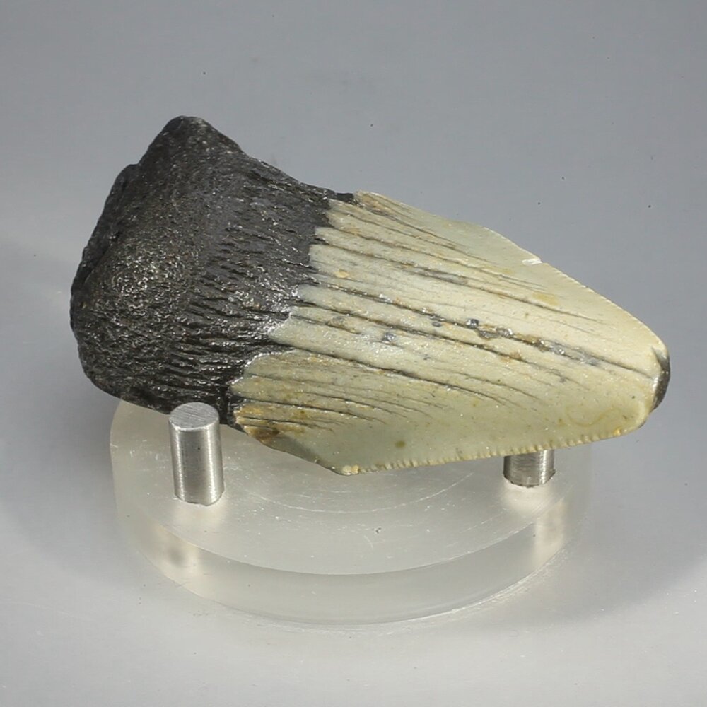 Megalodon teeth can be identified by their more regular triangular shape, robust structure, large size, fine edge serrations (not always visible on fossil remains), a lack of lateral denticles (side crowns), and the presence of a bourlette (the darker, chevron-shaped region near the tooth’s root). The largest Megalodon tooth found to date measures 7.1 inches on the diagonal, three times longer than any modern White Shark tooth!