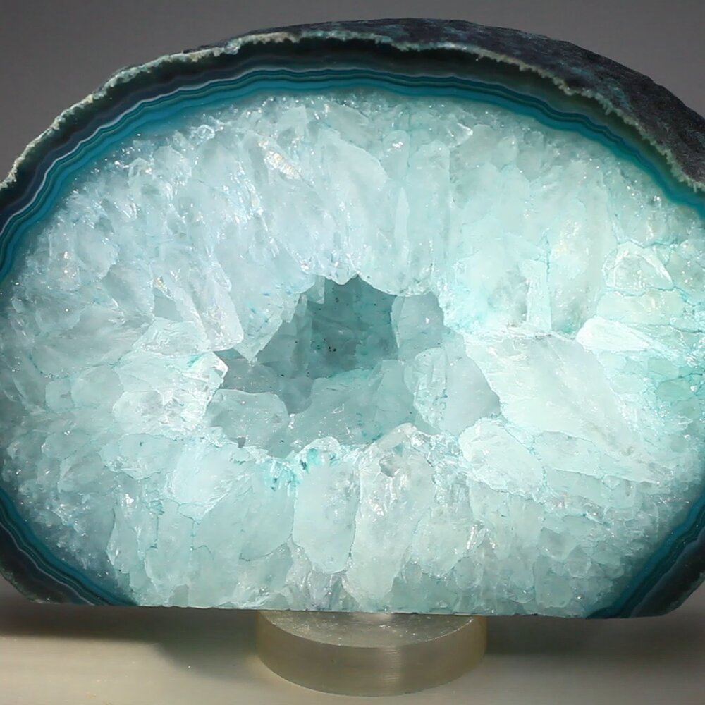 Agate is usually formed in the intense heat of volcanic rock. The different bands are created by variation of cooling and mineral content when the molten rock is gradually solidifying. Finally, quartz crystals grow to create the glittering central cavity.
