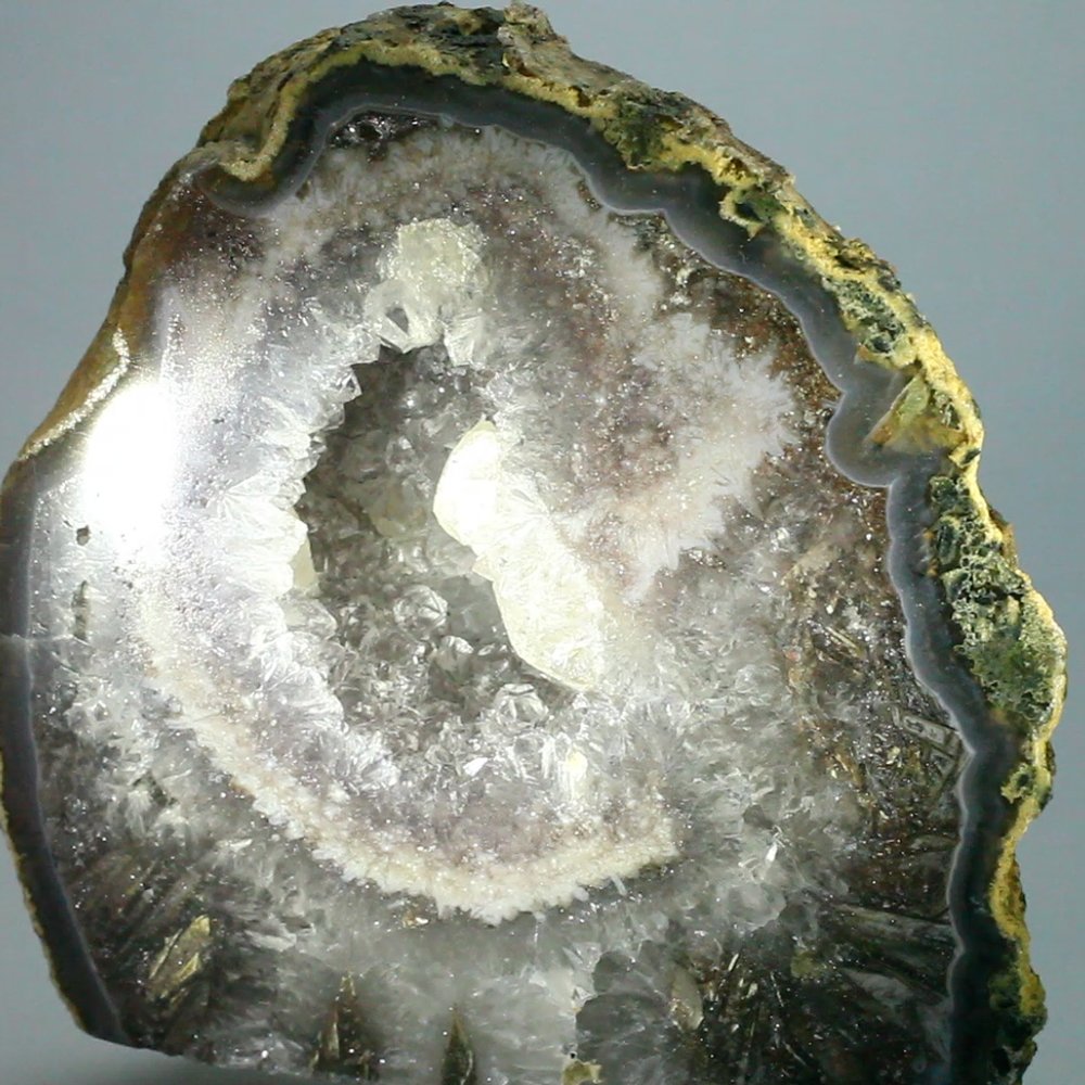 Agate is usually formed in the intense heat of volcanic rock. The different bands are created by variation of cooling and mineral content when the molten rock is gradually solidifying. Finally, quartz crystals grow to create the glittering central cavity.