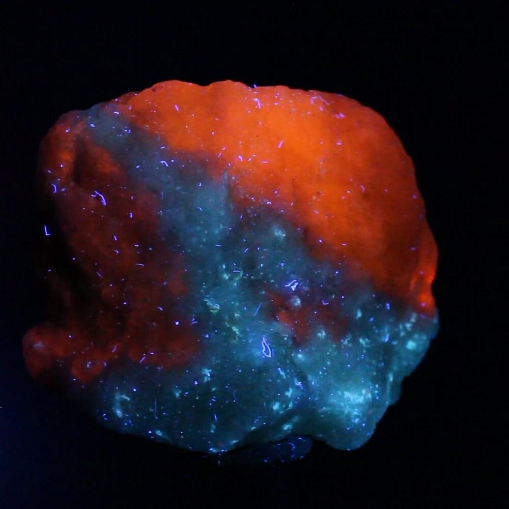 This specimen does not exhibit tenebrescence, but under Long Wave UV fluoresces a vibrant orange.