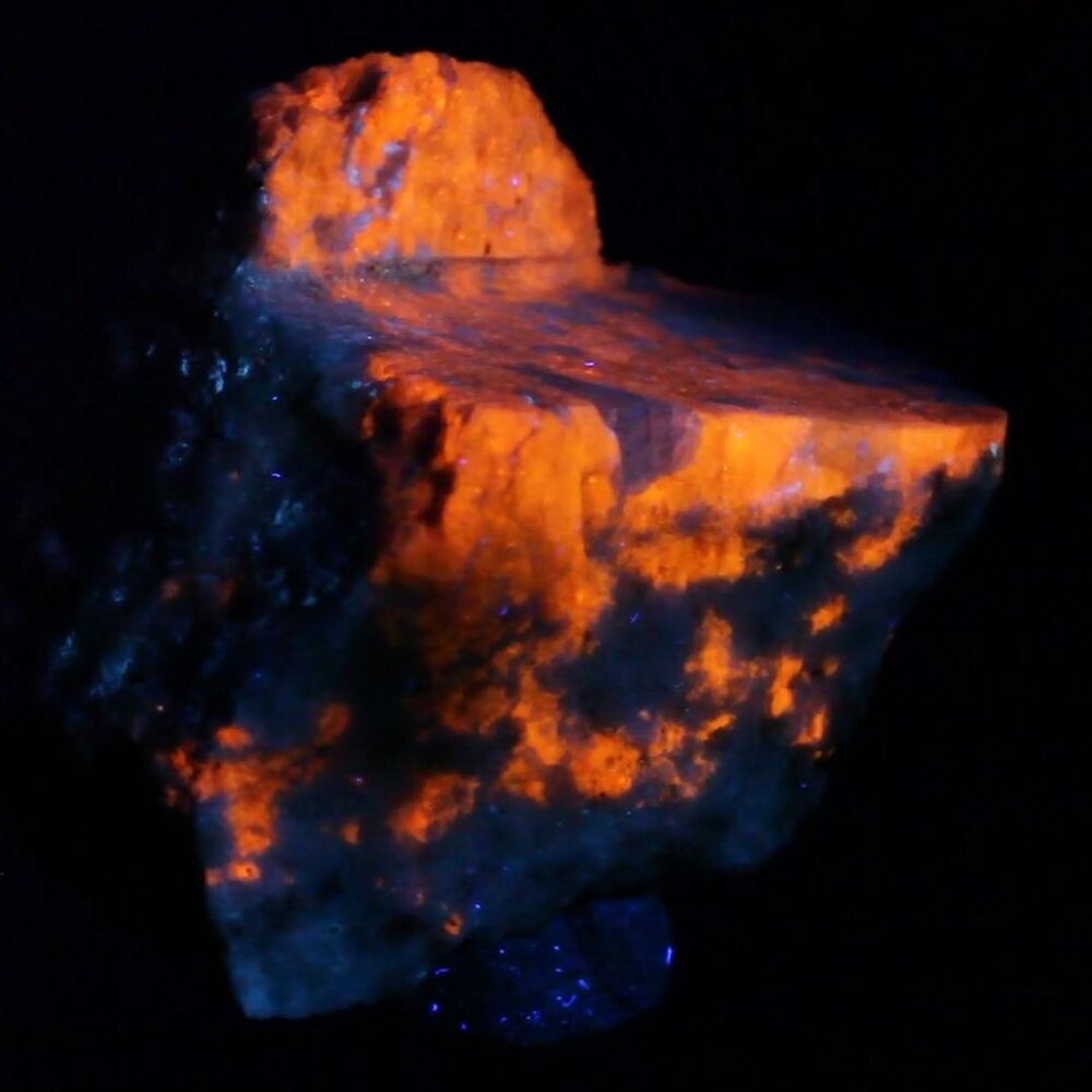 This specimen does not exhibit tenebrescence, but under Long Wave UV fluoresces a vibrant orange.