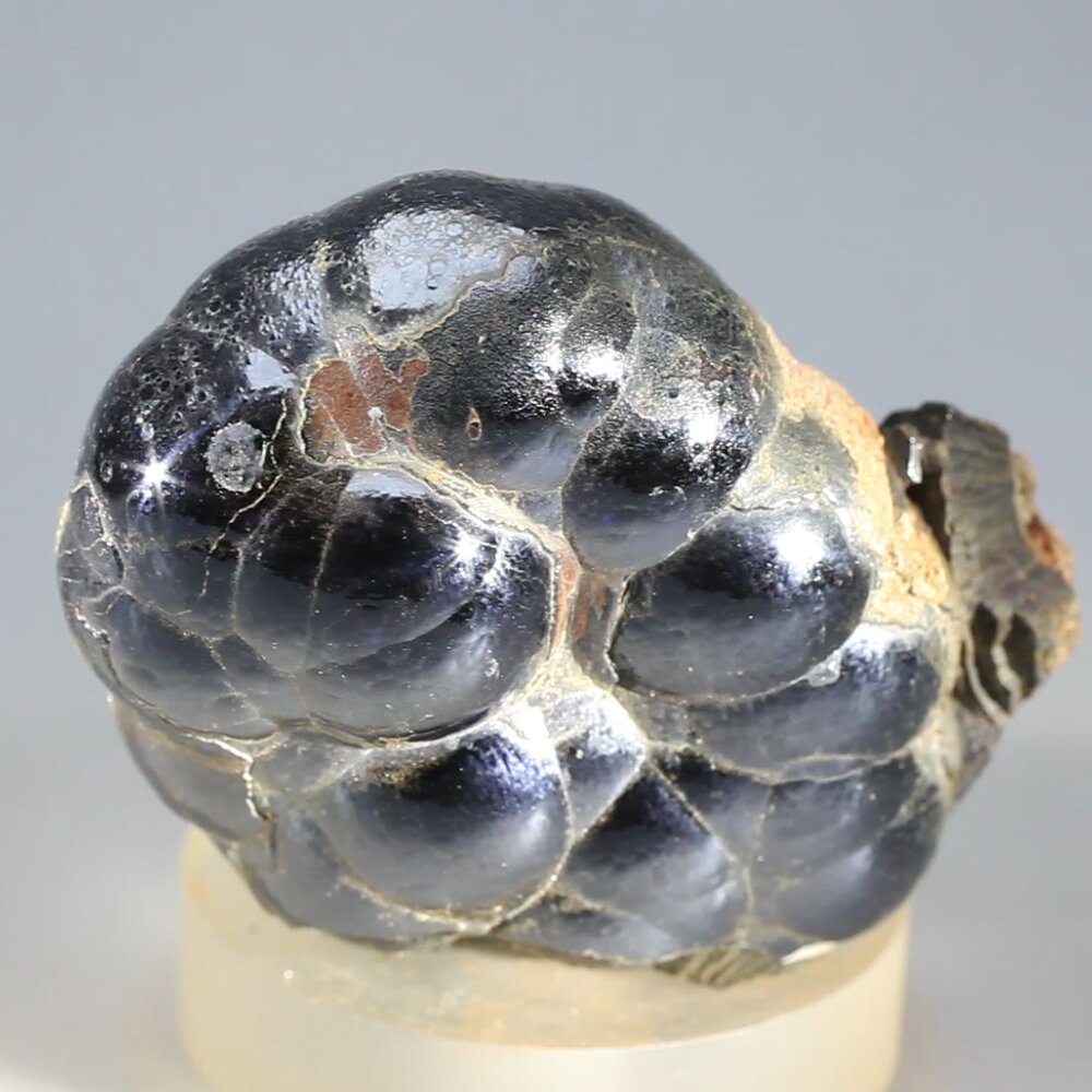 From the Irhoud Mine, Safi Province, Morocco, this Hematite& mineral specimen exhibits the characteristic rounded 'reniform' crystal structure which gave rise to Hematite's ancient name 'Kidney Ore'. The colour is dark grey to black, often with a quite lustrous appearance.