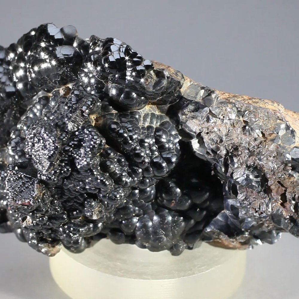 From the Irhoud Mine, Safi Province, Morocco, this Hematite& mineral specimen exhibits the characteristic rounded 'reniform' crystal structure which gave rise to Hematite's ancient name 'Kidney Ore'. The colour is dark grey to black, often with a quite lustrous appearance.