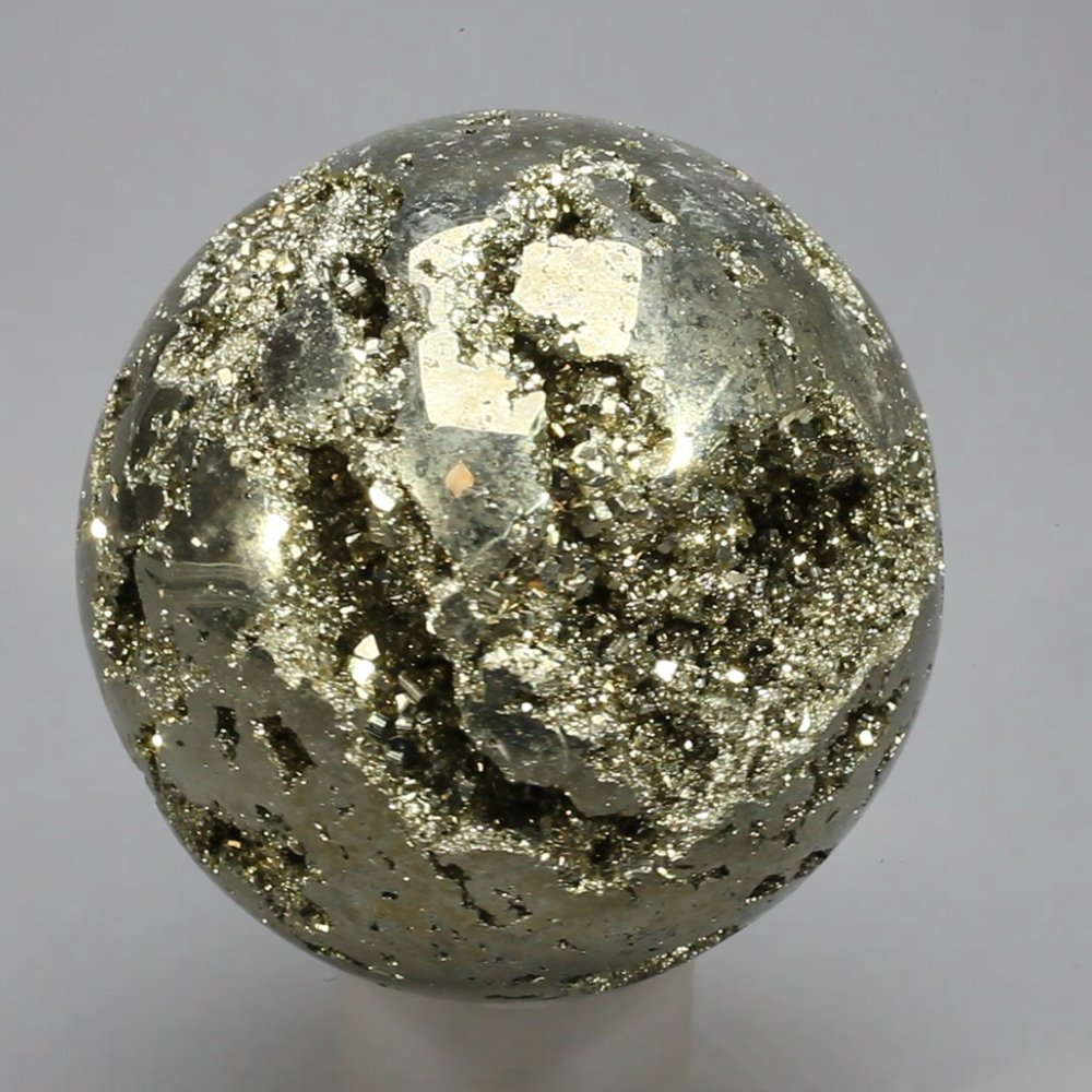 The Huanzala Mine of Peru has produced some of the world's finest pyrites. This large part polished Iron Pyrite Sphere is a bright and lustrous example, exhibiting a mass of brass-yellow, intergrown pyritohedrons. It is ideal for display, gifting or healing.