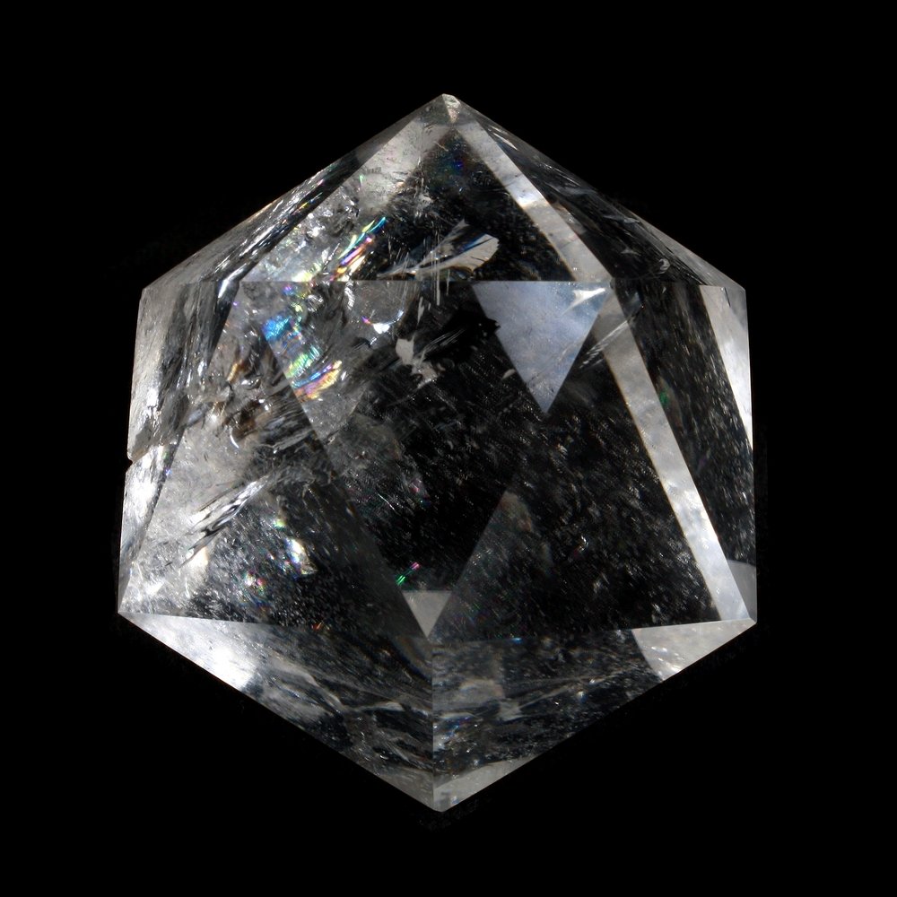 A stunning one-off Isosahedron Platonic Solid, hand carved from Quartz. This is a stunning piece with shimmering rainbows. The Isosahedron Platonic Solid is a triangle with twenty faces and represents the element of water. Quartz is best known as a master healer. It can be used for meditation, crystal healing and the pursuit of spiritual development. Quartz itself is considered the best crystal for focusing the mind and directing energy. This piece has been measured from its longest point.