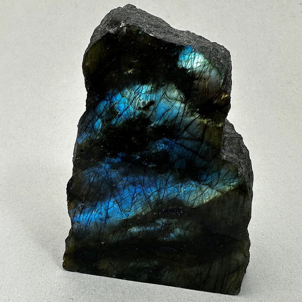 This stunning iridescent Free Standing Labradorite stone, which has been part polished, displays spectacular flashes of moving colours in blue, red, gold and bronze green.