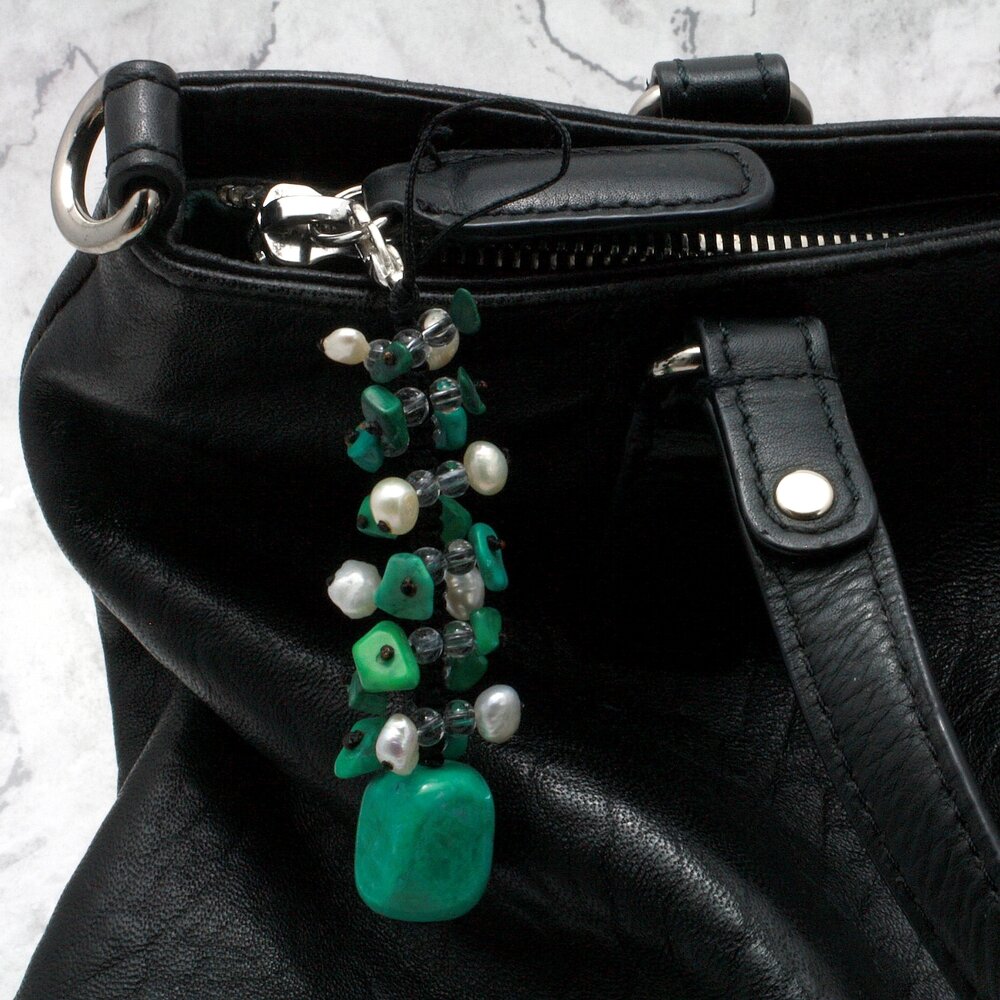 Each crystal charm is made from a smooth tumble stone, gem chips, and pearls. Each stone is has its own positive properties which work together to bring you the effect you desire. Perfect for attaching to your bag, keys or mobile phone. The crystals are attached along a sturdy braided string, with loop and clip so that you can hang it anywhere.