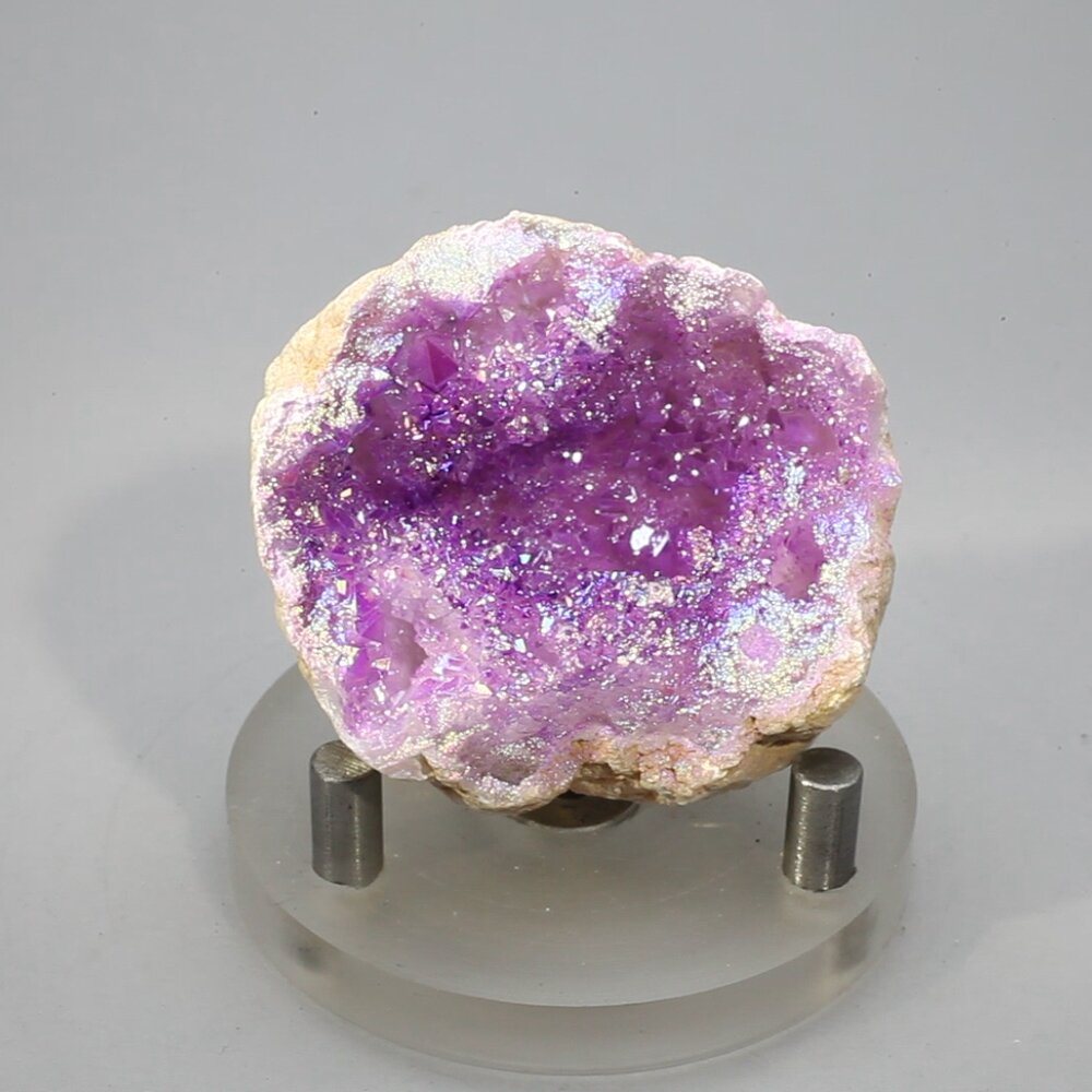 Aura Quartz is created by coating the surface of natural quartz with a layer of various metals. The coatings are extremely thin and create a beautiful iridescent effect by refracting light as it passes through the coating.