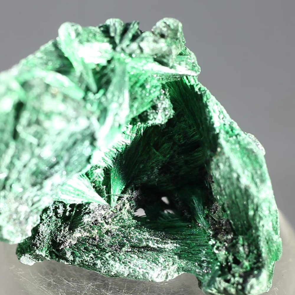 An attractive specimen of fibrous Malachite from the Democratic Republic of Congo. This example displays a mass of lovely crystals of bright and lustrous emerald green.