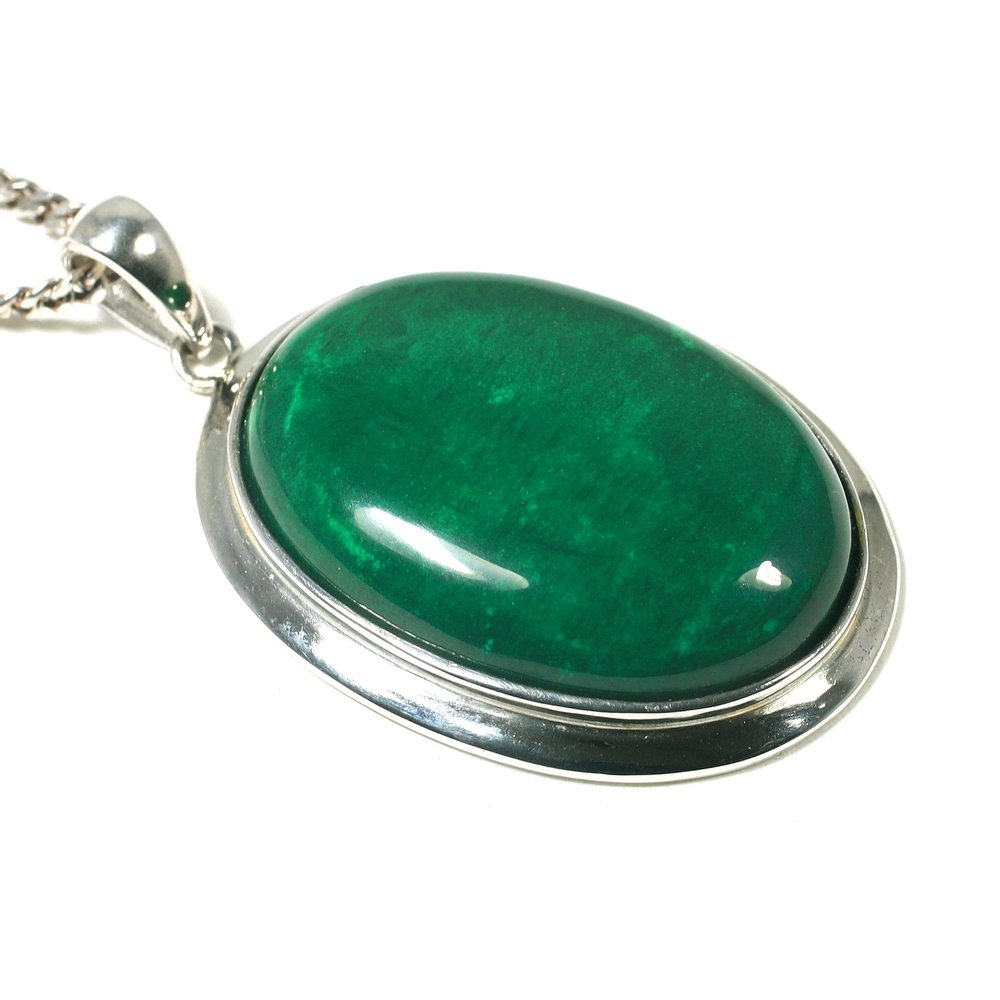 This arresting pendant features a malachite howlite cabochon set in pure silver, itself a symbol of protection. The silver enhances the green hue and creates a shining accent for any outfit.
