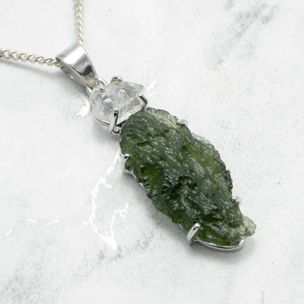 Make a statement with this beautiful Moldavite & Herkimer Diamond Silver Pendant. This piece of Moldavite is set into 925 Sterling Silver, its rich green colour stands out and contrasts beautifully with the Herkimer Diamond.