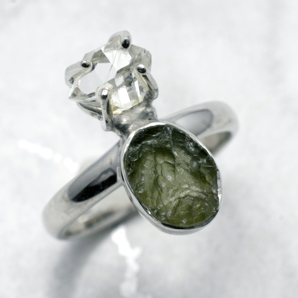 Make a statement with this beautiful Moldavite & Herkimer Diamond Silver Ring. This piece of Moldavite is set into 925 Sterling Silver, its rich green colour stands out and contrasts beautifully with the Herkimer Diamond.