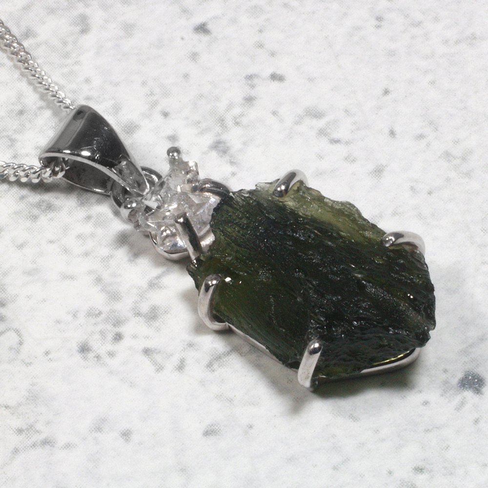 Make a statement with this beautiful Moldavite & Herkimer Diamond Silver Pendant. This piece of Moldavite is set into 925 Sterling Silver, its rich green colour stands out and contrasts beautifully with the Herkimer Diamond.