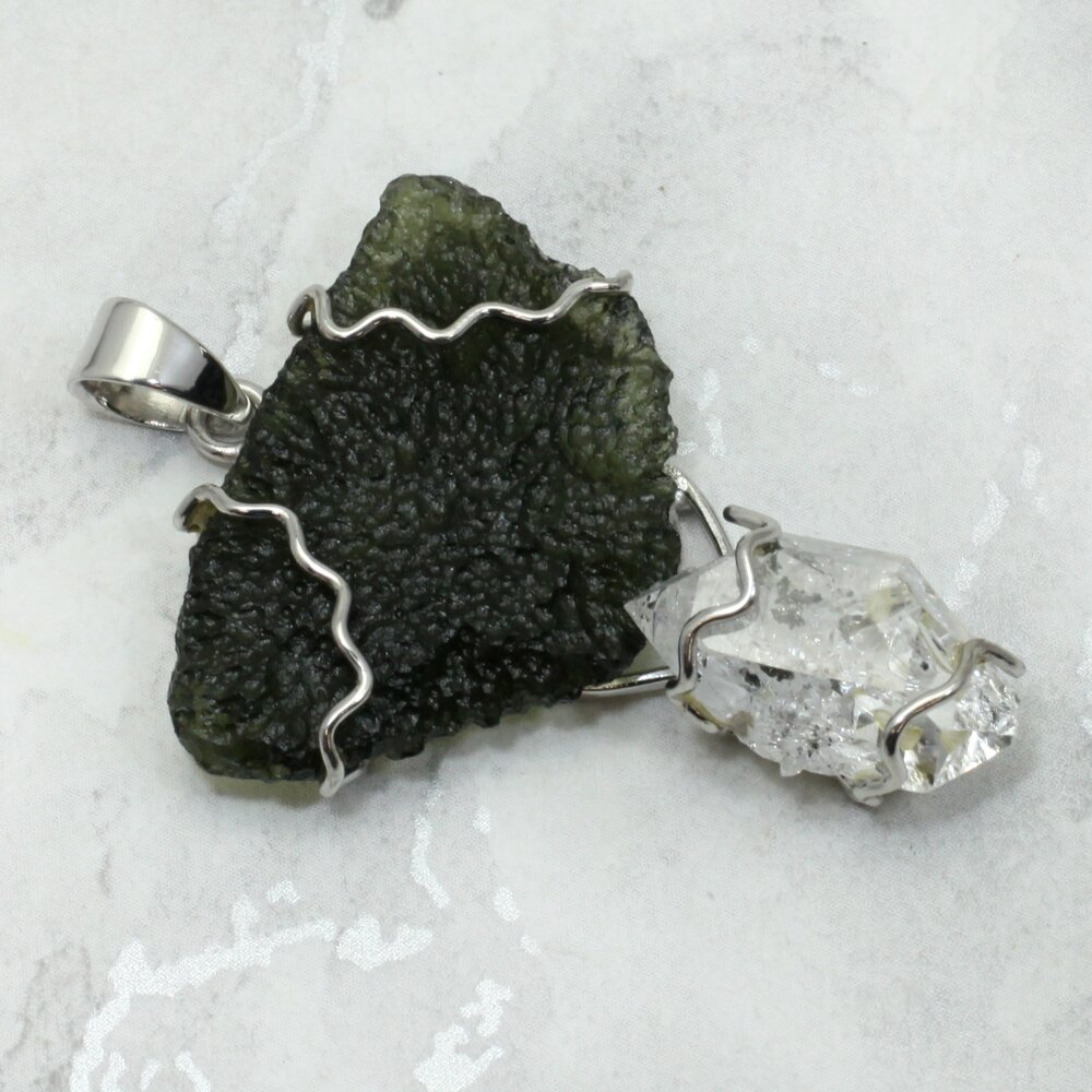 Make a statement with this beautiful Moldavite & Herkimer Diamond Silver Pendant. This piece of Moldavite is set into 925 Sterling Silver, its rich green colour stands out and contrasts beautifully with the Herkimer Diamond.