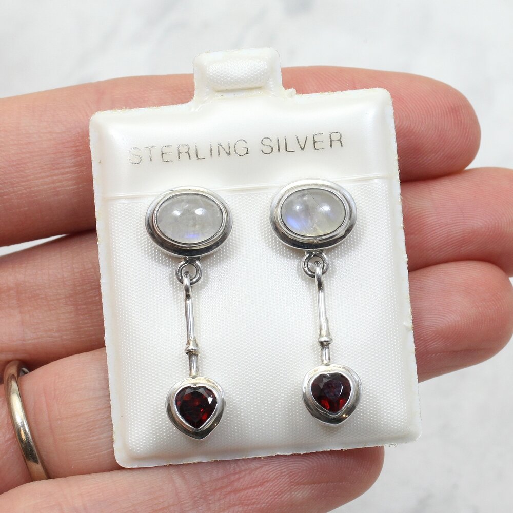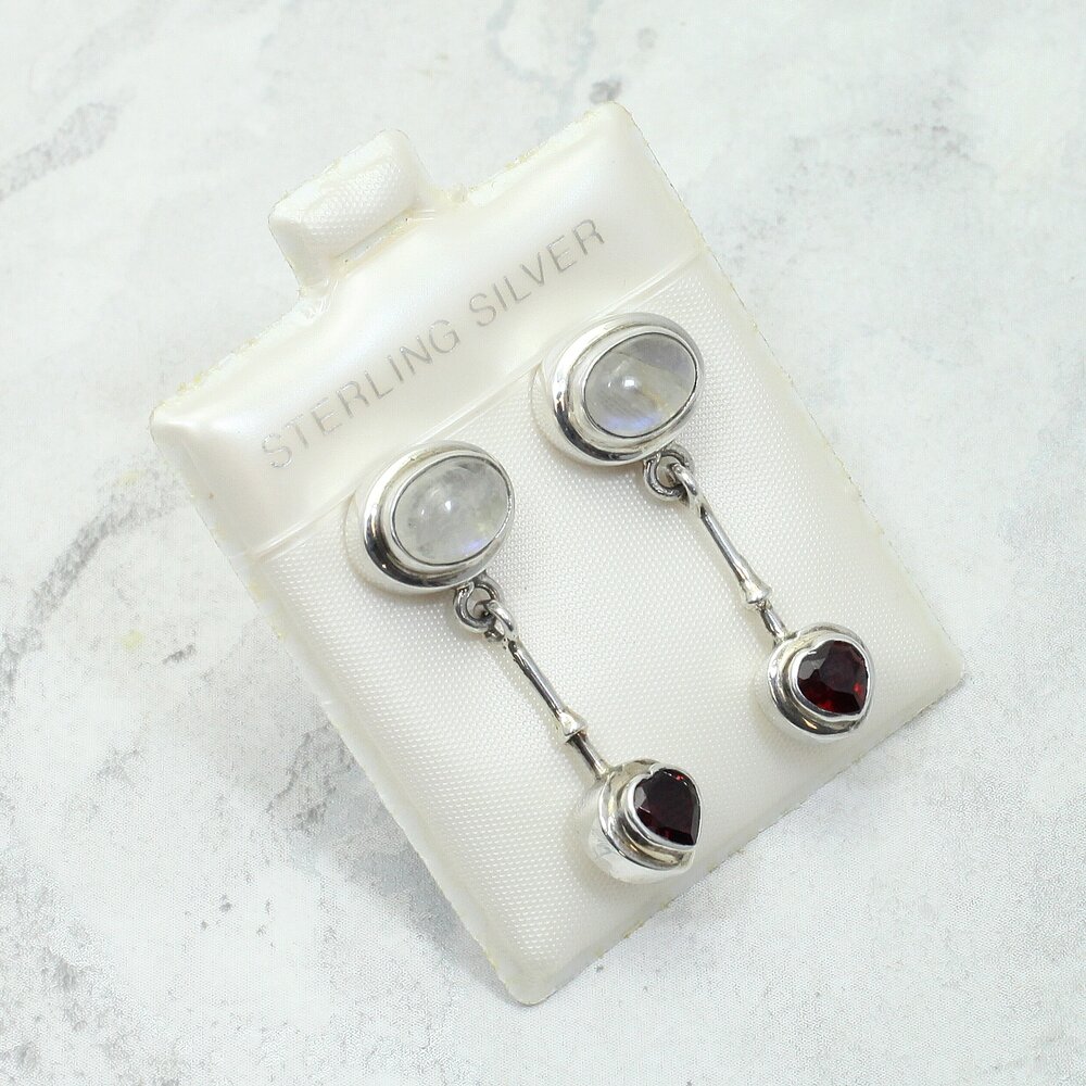 Moonstone & Garnet 925 Silver Heart Drop Earrings.