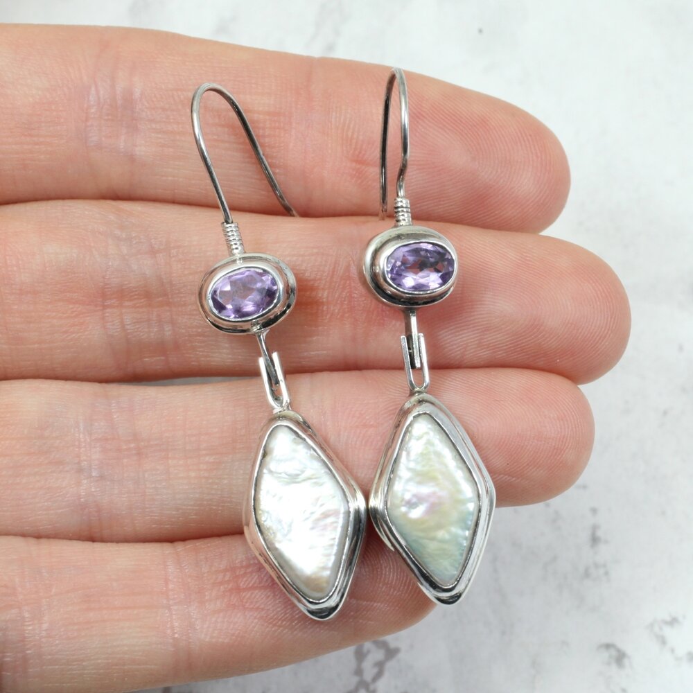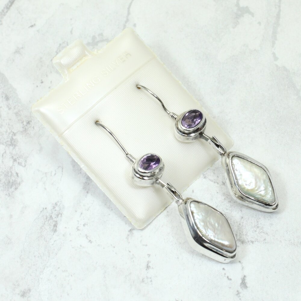 Mother of Pearl & Faceted Amethyst 925 Silver Drop Earrings.