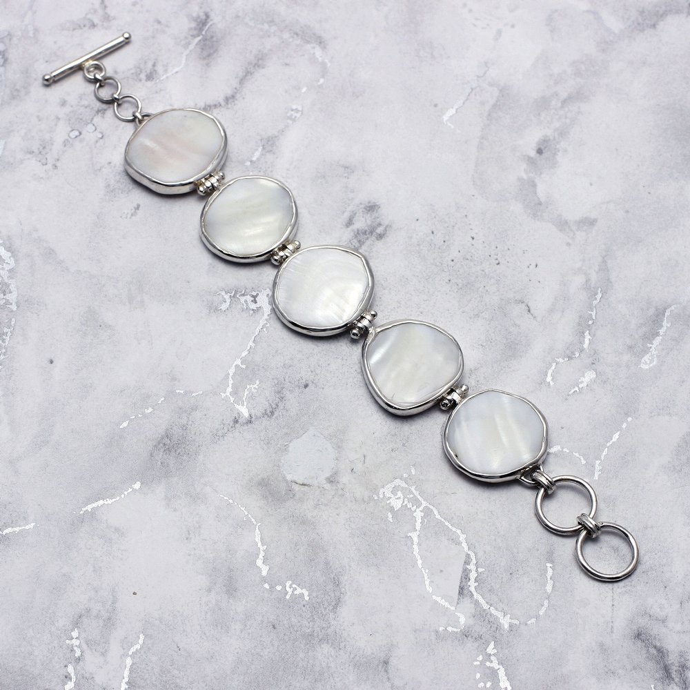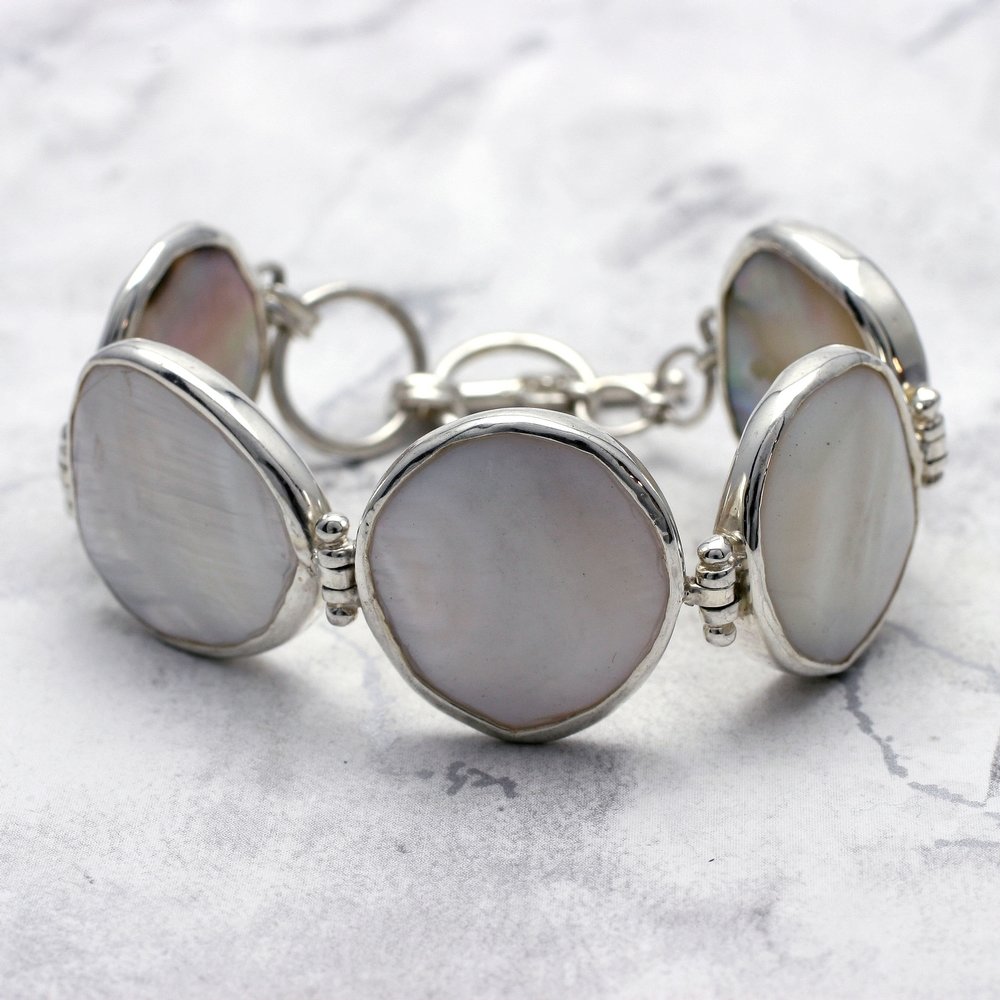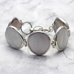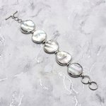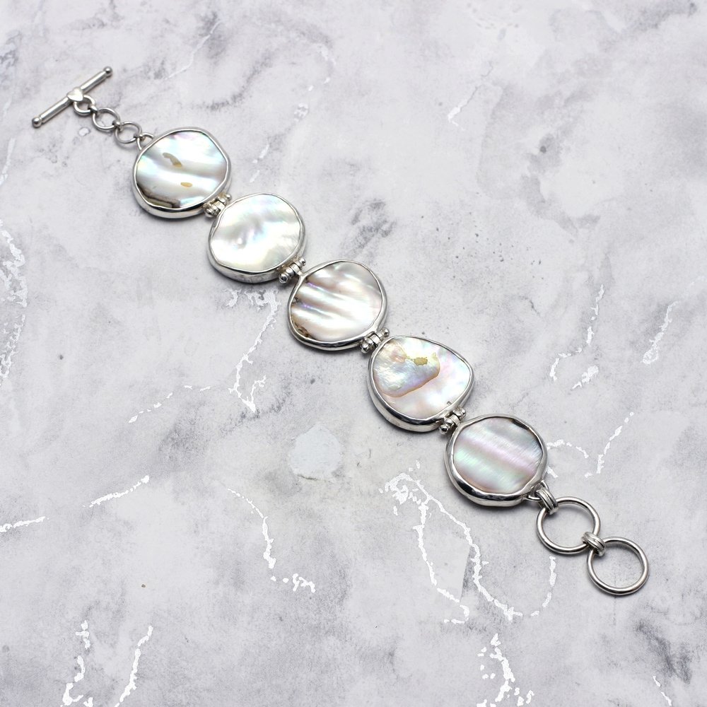 This beautiful bracelet can be worn two ways, one side has the beautiful irridesence of the pearl, and the other side is a shiny, bright and creamy white. The small heart detail in the .925 silver really sets it off. This would look absolutely stunning at a beach wedding.
