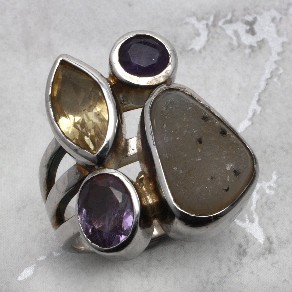 Make a glamorous statement with this Multi Gemstone ring. This triple band ring features two faceted Amethyst stones and Citrine with lovely rich colours. They are complimented by a Druzy Quartz that really sparkles in the light, each ring has a slightly different druzy quartz but they are all similar and bright.