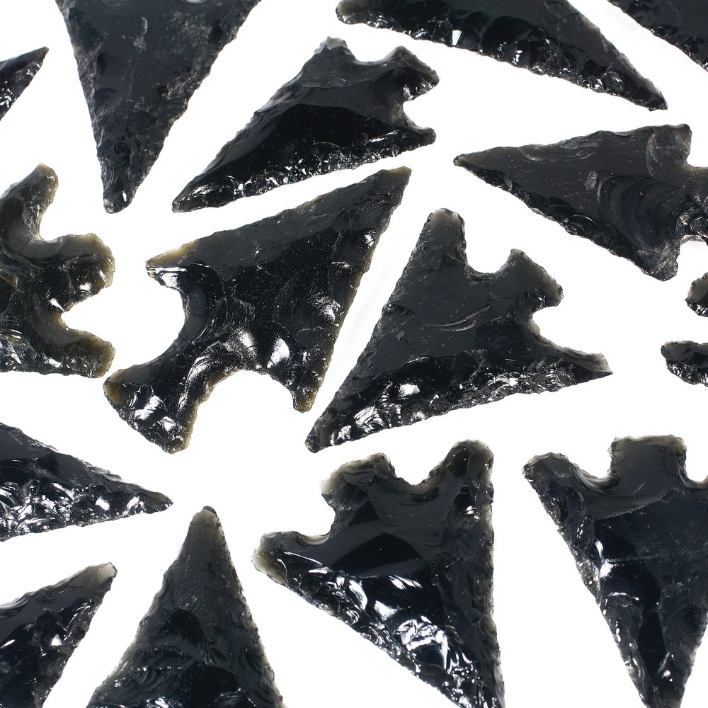 Beautiful large Obsidian Arrowheads of varying shapes and sizes, all shining with the lustrous black of obsidian. These obsidian arrowheads make great grounding stones and are believed to protect against harm.