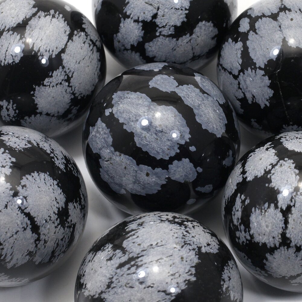Snowflake Obsidian is a delicate variety of the crystal, displaying pretty grey snowflake patterns, formed by inclusions of grey feldspar.
