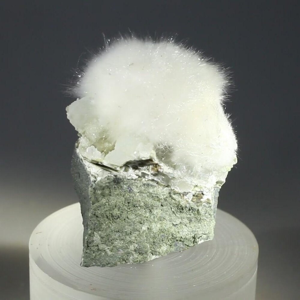 This Okenite Mineral Specimen displays the wonderful texture of this delicate crystal. Okenite features crystals so straight and fine that they look like wool fibres. These form cottony clusters and create a wonderful fluffy texture.