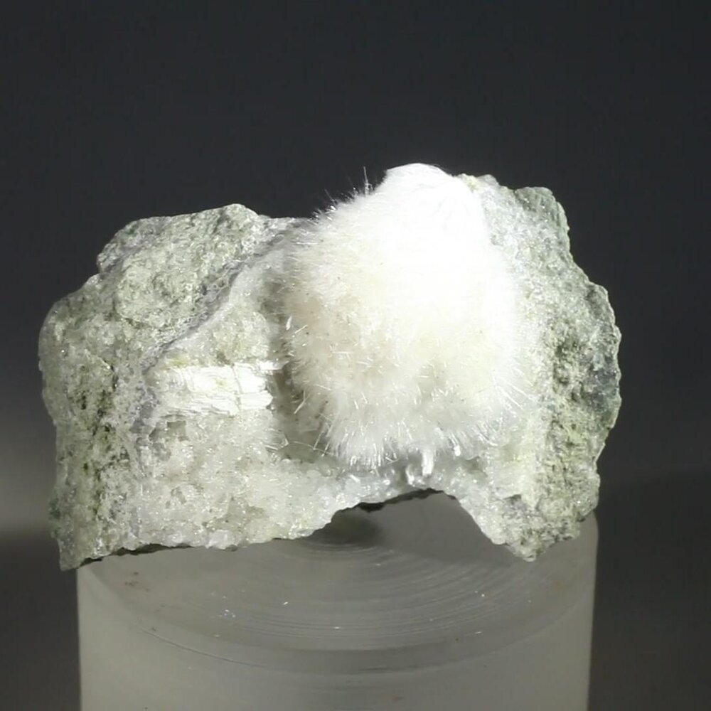 This Okenite Mineral Specimen displays the wonderful texture of this delicate crystal. Okenite features crystals so straight and fine that they look like wool fibres. These form cottony clusters and create a wonderful fluffy texture.