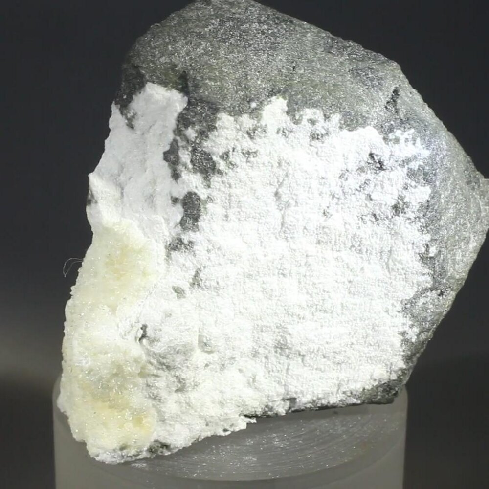 This okenite specimen has a central cavity filled with these 'cotton ball' clusters. This fluffy texture contrasts with the rough grey outer surface of the specimen making for a captivating piece.