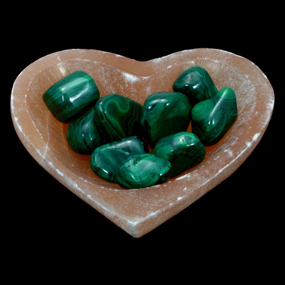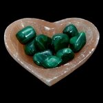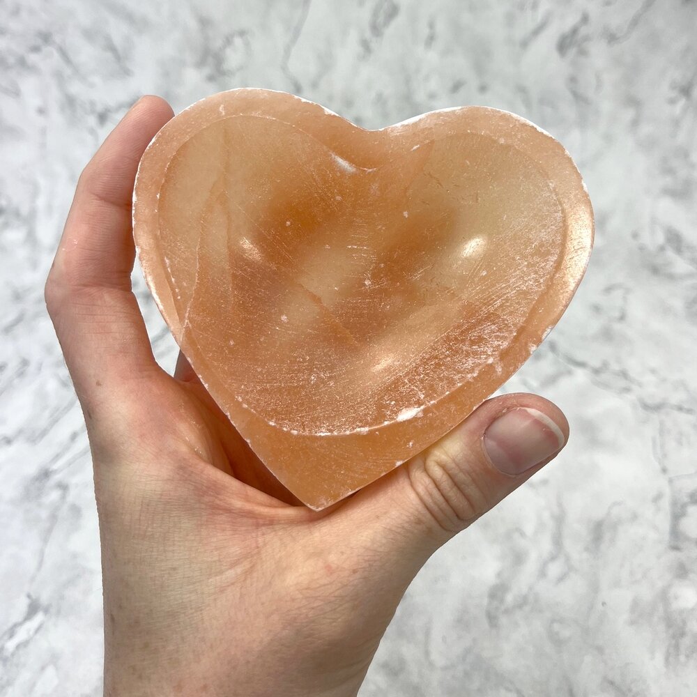 This beautiful heart shaped peach Selenite Charging Bowl has fine crystals that are said to direct energy amongst crystals placed in it.