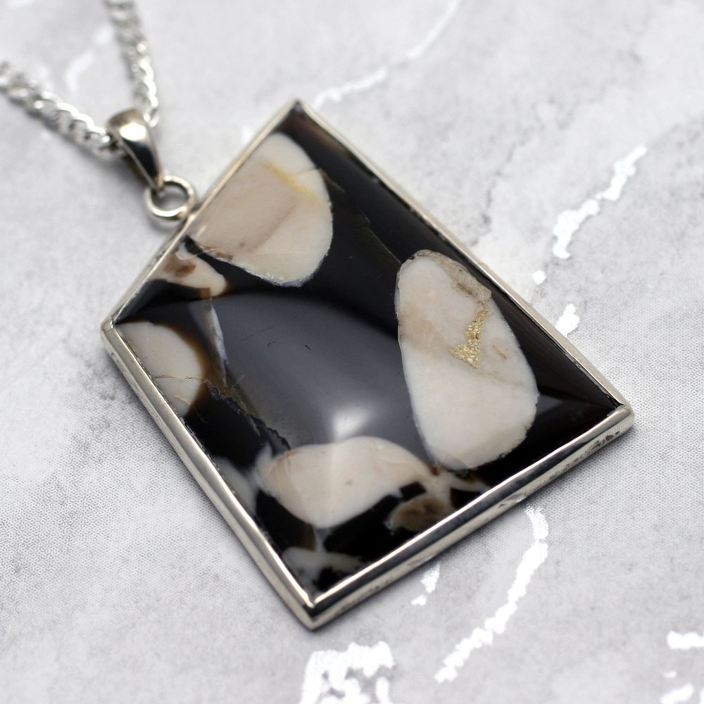 Make a statement with this eye-catching Silver and Peanut Wood Pendant. The fossilised peanut wood has a gorgeous pattern with a rich chocolate colour. It is easy to wear but adds artistic chic to any outfit.