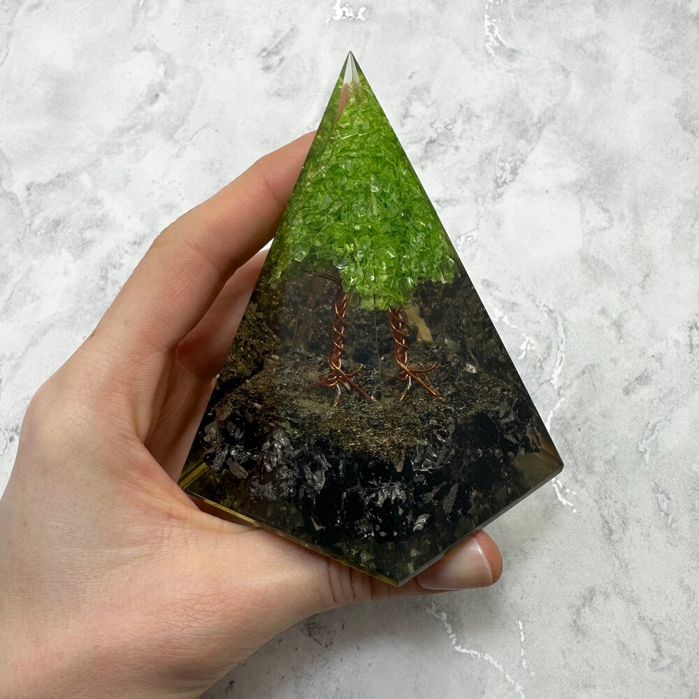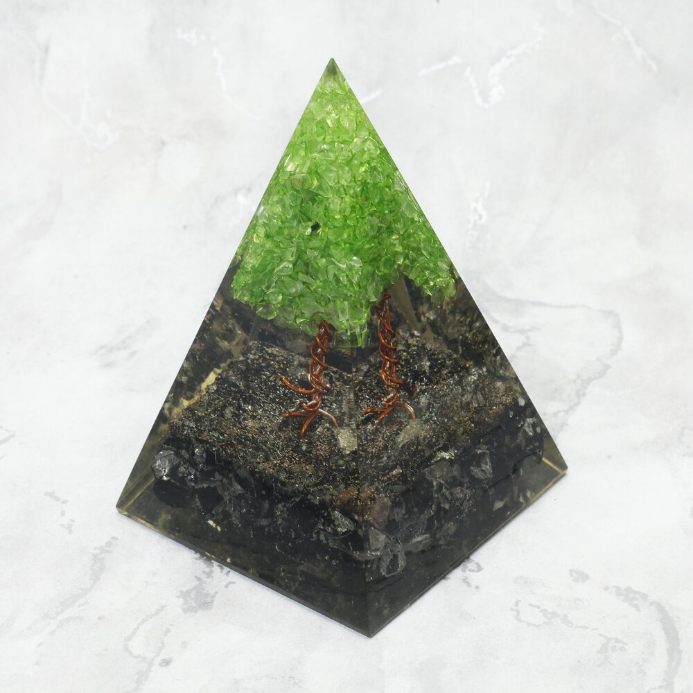 A truly stunning Peridot & Tourmaline Tree Of Life Orgonite.