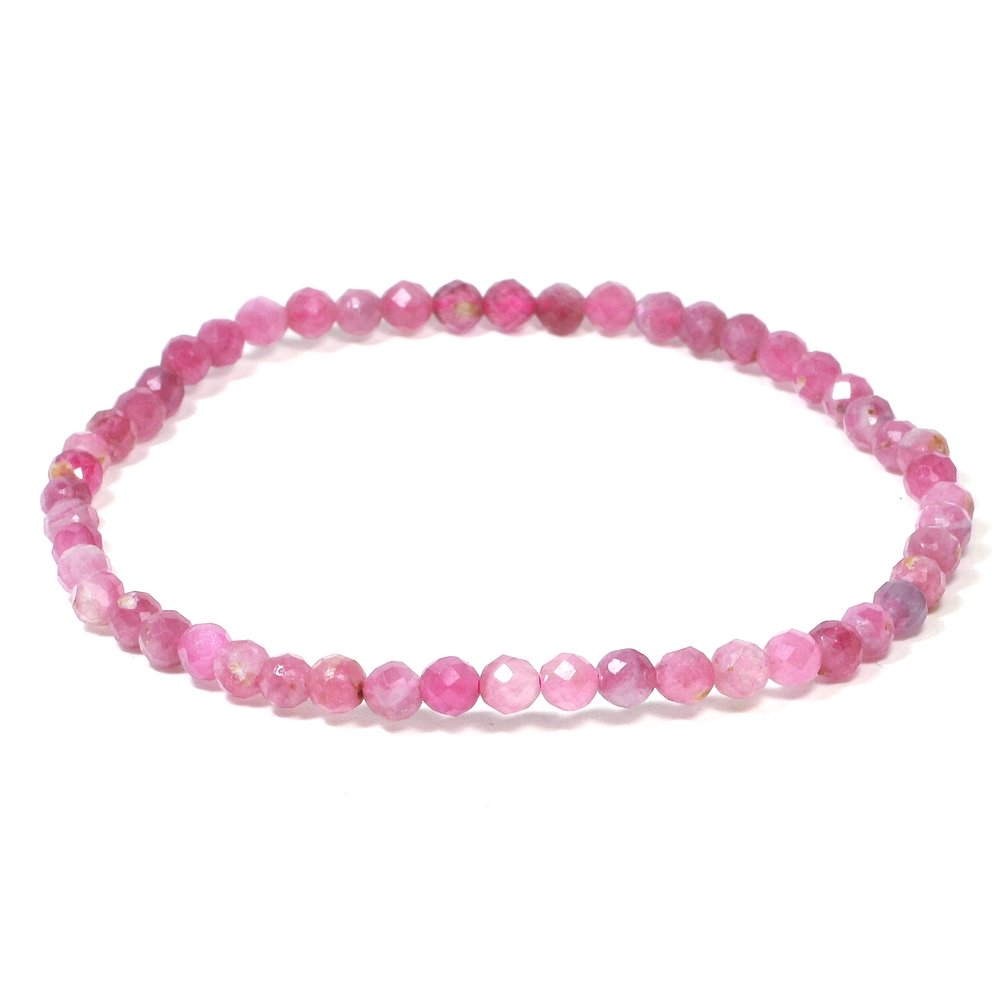 This Pink Tourmaline 3mm Faceted Mini Bead Bracelet has been carefully shaped and polished to bring out the beautiful colour of the stone. It is strung on coordinating elastic that fits any wrist, making it comfortable and easy to wear.