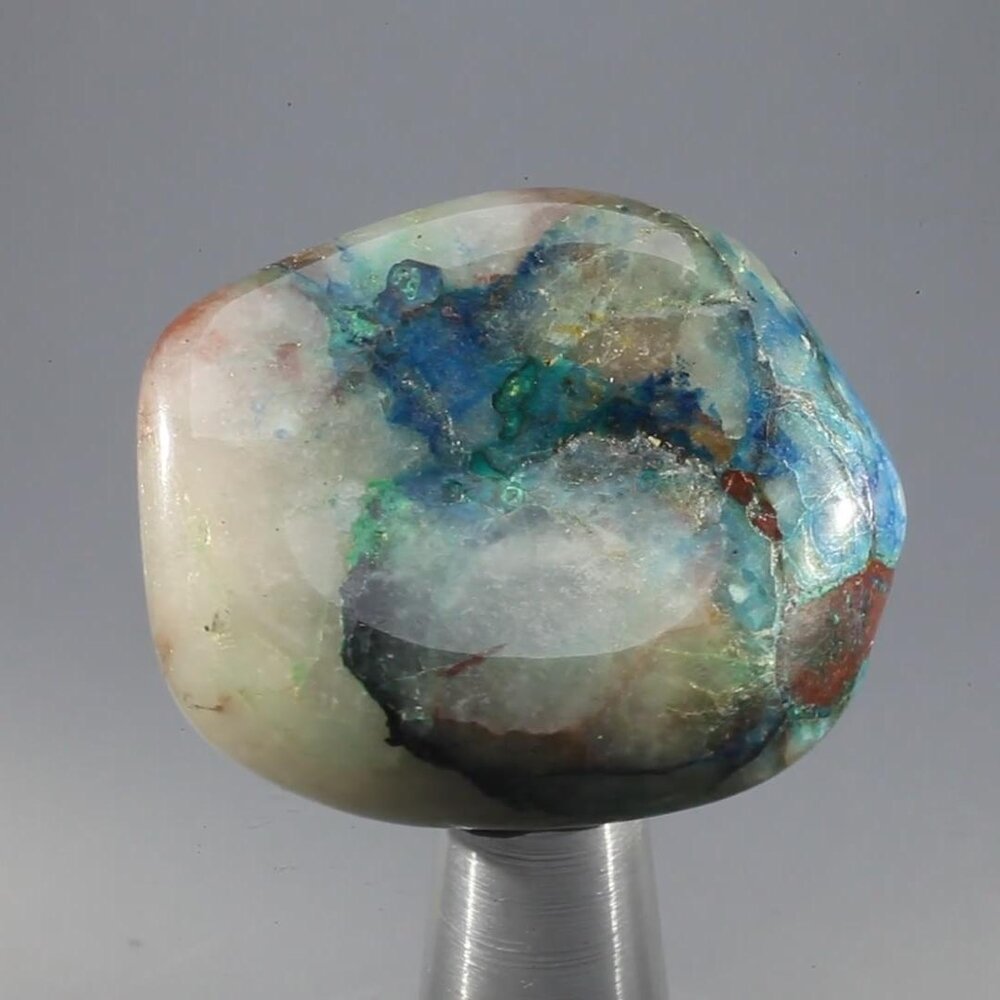 The soothing mix of beautiful blue-green-turquoise colours in this Quantum Quattro Polished Stone is a combination of chrysocolla, malachite and shattuckite on smoky quartz.
