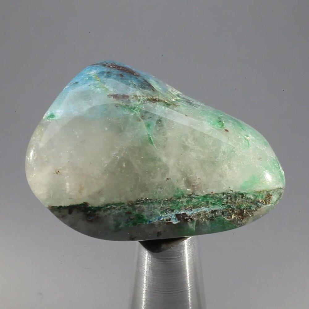 The soothing mix of beautiful blue-green-turquoise colours in this Quantum Quattro Polished Stone is a combination of chrysocolla, malachite and shattuckite on smoky quartz.