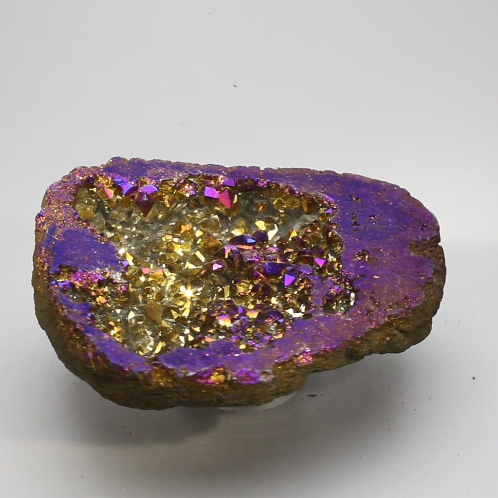 This beautiful Rainbow Aura Quartz Geode glows with colour and sparkles in sunlight. Rainbow Aura Quartz is the result of titanium infused with Clear Quartz Crystals to produce the gorgeous vibrant colour you see. The crystal displays a range of rainbow colours with a light and airy finish that brings radiance to any space.