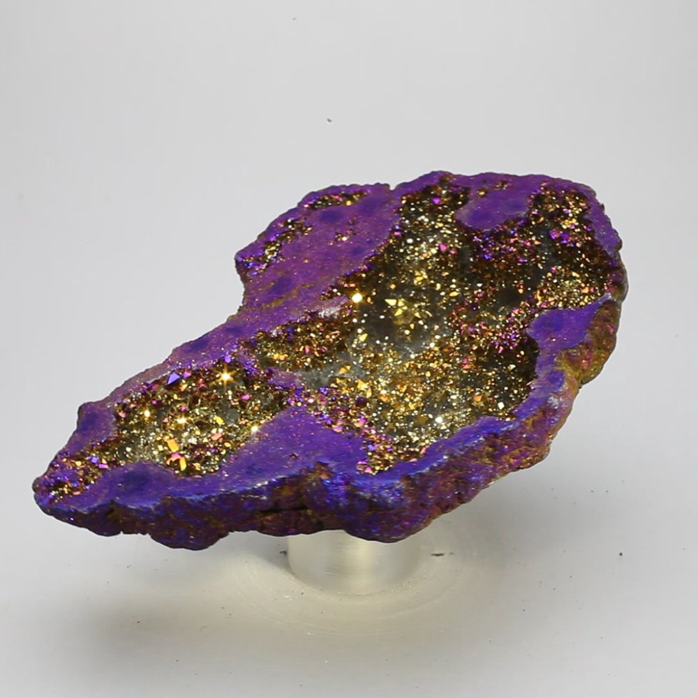 This beautiful Rainbow Aura Quartz Geode glows with colour and sparkles in sunlight. Rainbow Aura Quartz is the result of titanium infused with Clear Quartz Crystals to produce the gorgeous vibrant colour you see. The crystal displays a range of rainbow colours with a light and airy finish that brings radiance to any space.