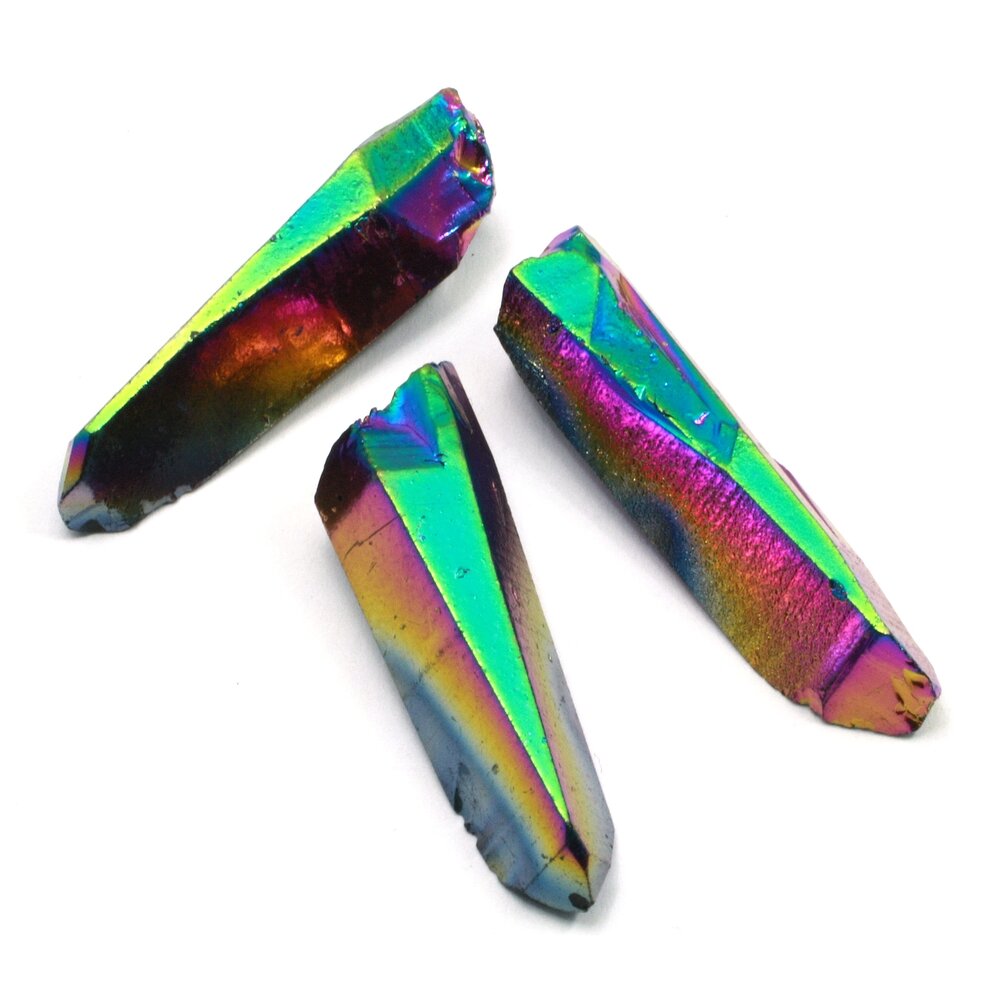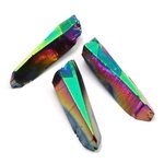 Aura Quartz is created by coating the surface of natural quartz with a layer of various metals. The coatings are extremely thin and create a beautiful iridescent effect by refracting light as it passes through the coating. An intense radiant energy emanates from the different varieties of Aura Quartz according to the different combination of metals present.