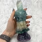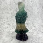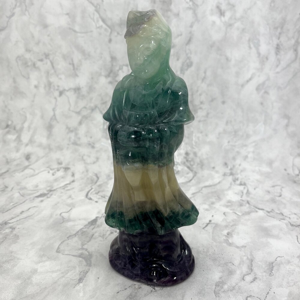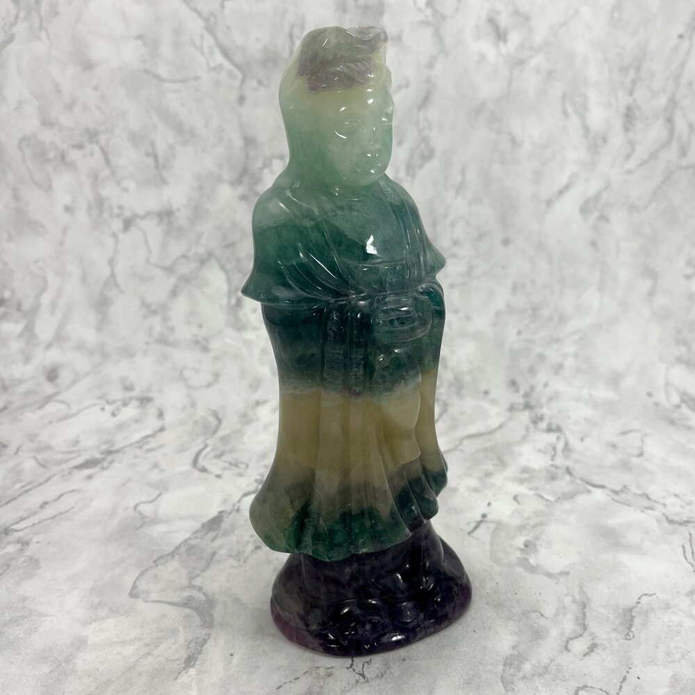 This stunning Kwan Yin figurine has been expertly hand carved from Rainbow Fluorite with wonderful detail and precision. Kwan Yin is the model of Chinese beauty, a gracious woman who is usually depicted as barefoot and holding a vase filled with the tears of compassion.
