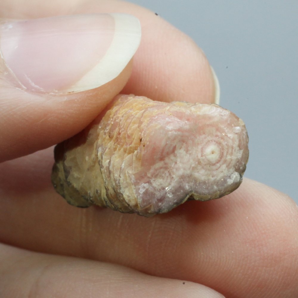 A pretty Rhodochrosite Stalagmite Stem, displaying rings of pink, cream and grey. This beautiful specimen would make a great gift or addition to your collection.