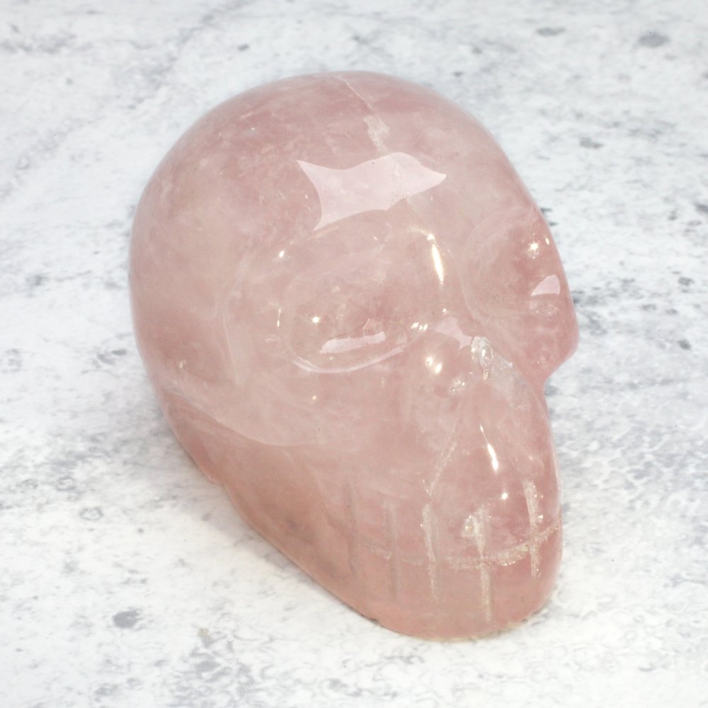 This crystal skull has been expertly carved from a single piece of rose quartz. Rose Quartz aligns with the Heart Chakra, governing the emotions, especially love, and is known as the "love stone". It can be used to nurture, attract love, promote self-acceptance or, on a more spiritual level, love of whatever you hold sacred or Divine. It is extremely supportive for the broken-hearted or recently bereaved, as well as strengthening the bond between mother and newborn.