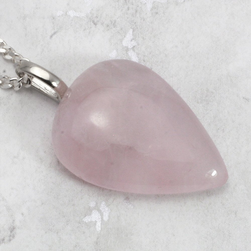 This pendant features superior quality rose quartz set in sterling silver. Rose quartz is known as the 'Stone of Love'. It is said to attract love of all kinds and increase our ability to feel and act compassionately. Rose quartz is also considered very supportive for insomnia and grief. This rhodium plated rose quartz crystal pendant is a positive and stylish gift for any occasion.