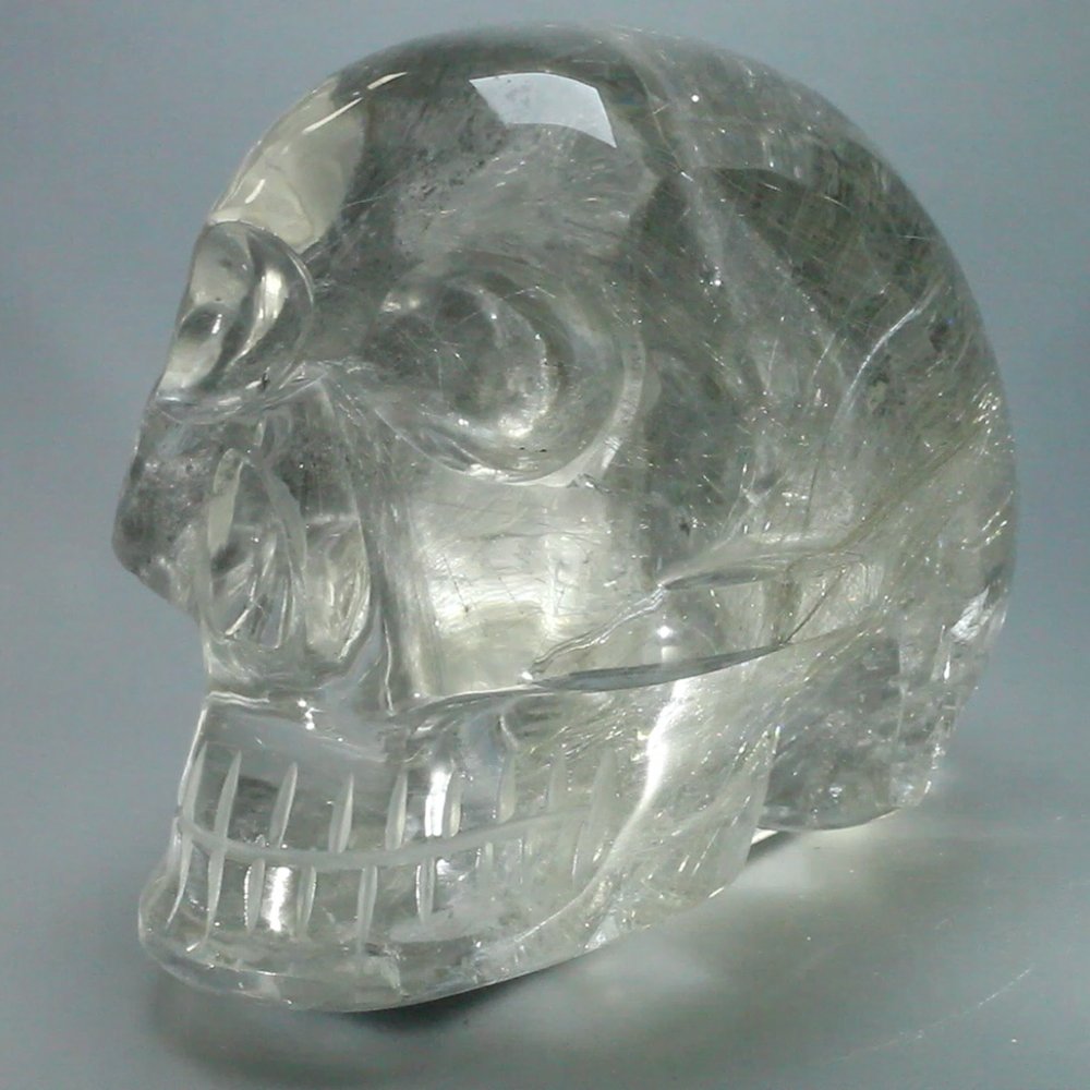 This crystal skull has been expertly carved from a single piece of rutilated quartz. Rutilated quartz is believed to combine the cleansing energy of quartz with strength and authority. It is said to lift depression and connect the root and crown chakras.
