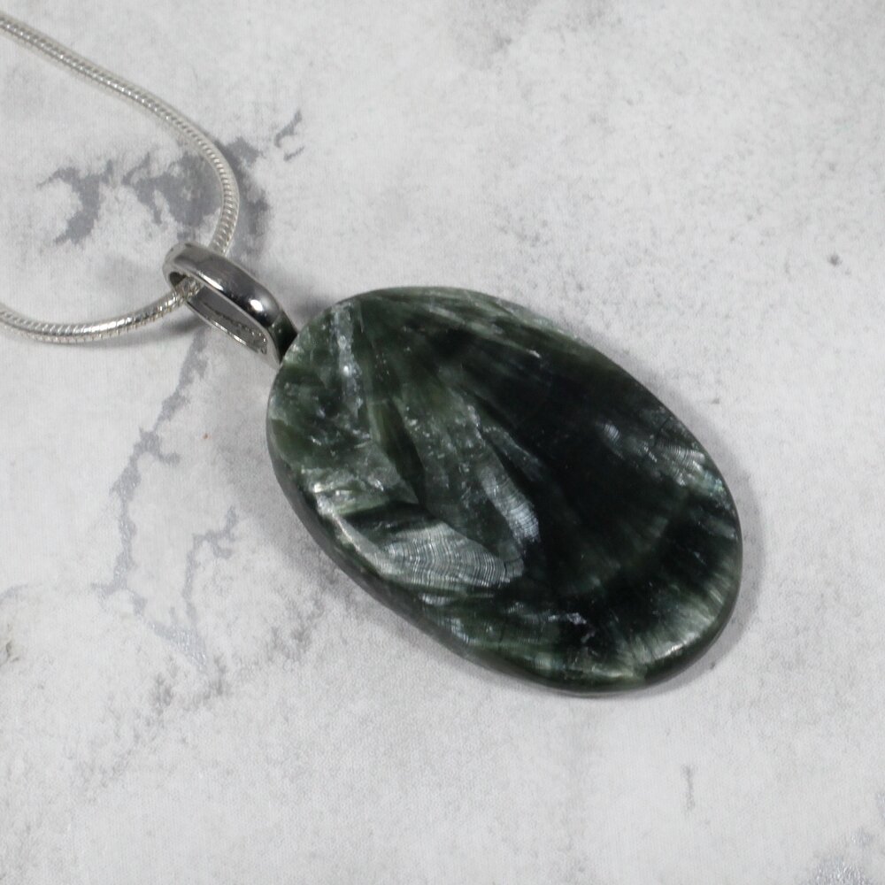 This eye-catching Seraphinite Pendant has been mounted on a rhodium plated bale.