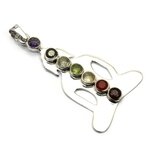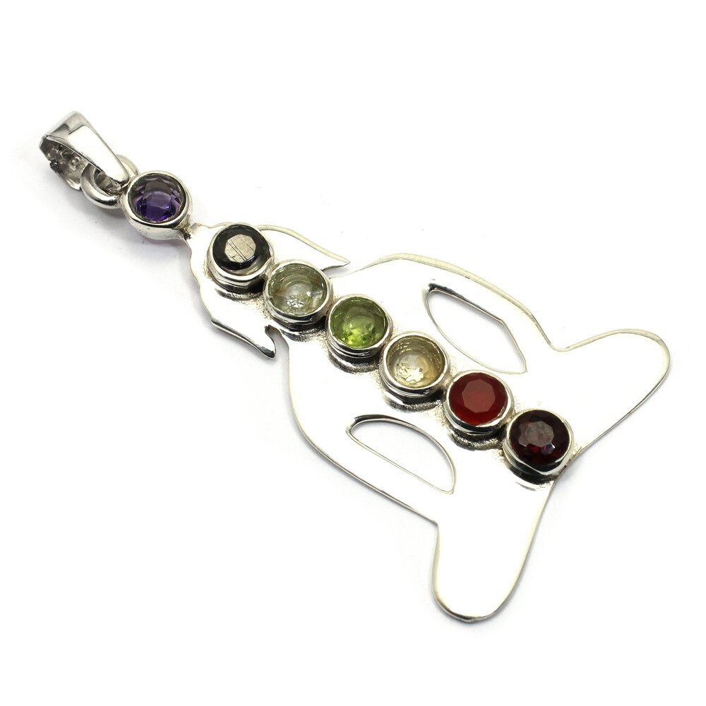 This Buddha 925. Sterling Silver Pendant contains stones selected for their affinity with each of the Seven chakras.