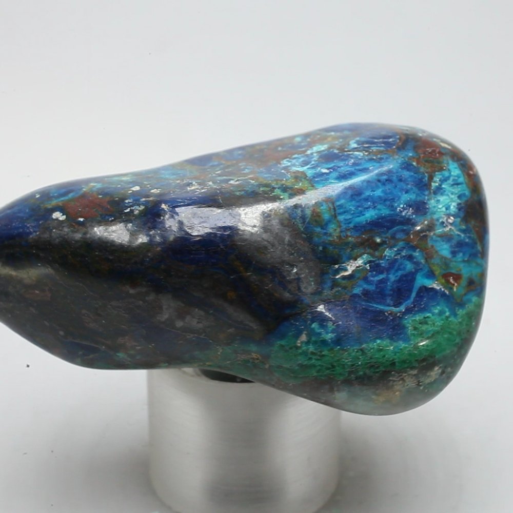 Shattuckite is a rare copper mineral often found in close association with Malachite, Chrysocolla and Dioptase. These tumblestones originate from Katanga, Democratic Republic of Congo.