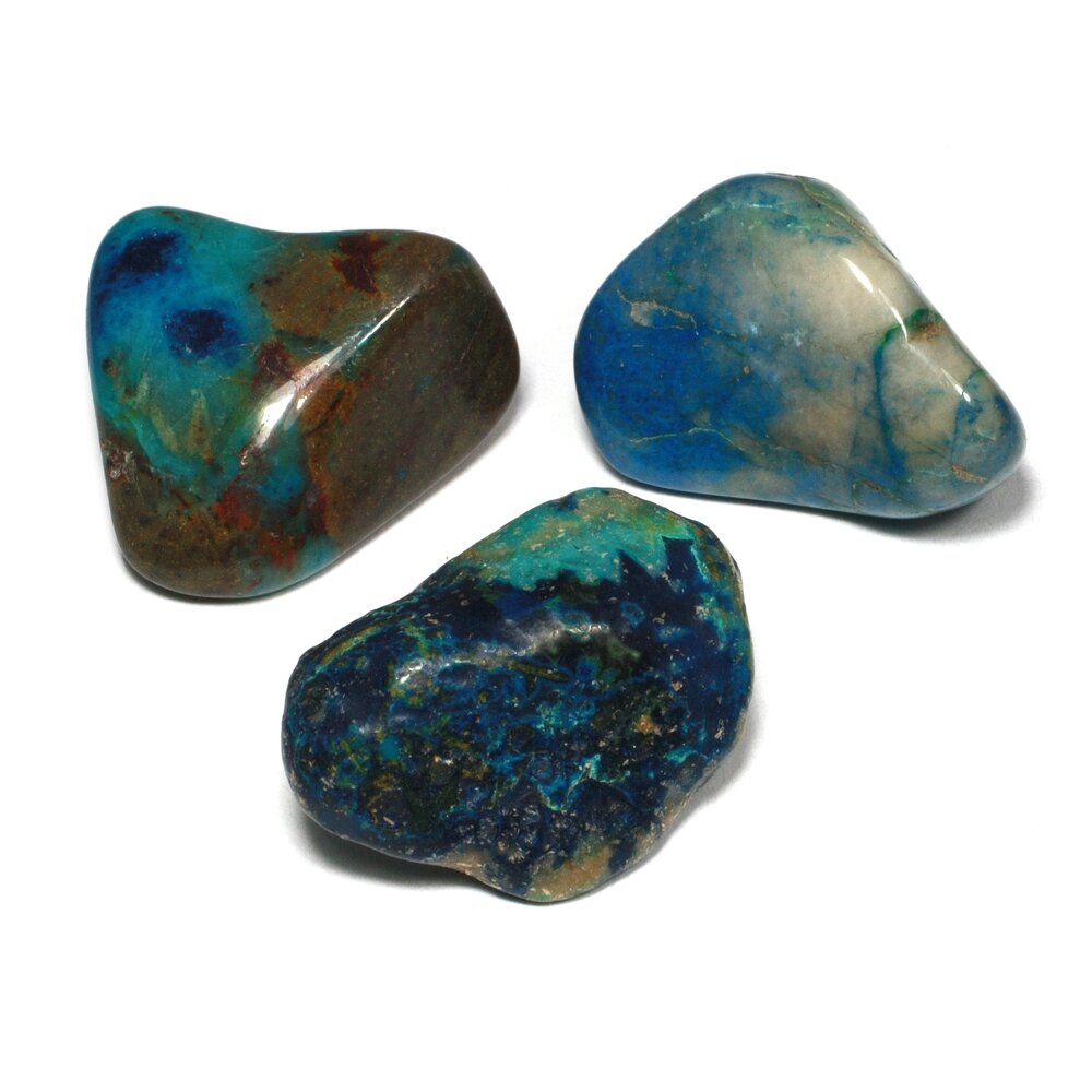 Shattuckite is a rare copper mineral often found in close association with Malachite, Chrysocolla and Dioptase. These tumblestones originate from Katanga, Democratic Republic of Congo.