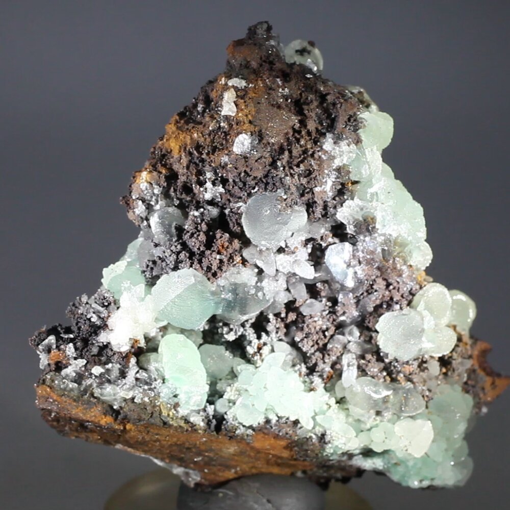 Pale translucent blue/green Smithsonite on a limonite matrix from the famous San Antonio Mine, Chihuahua, Mexico.