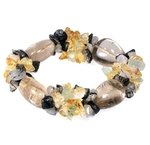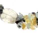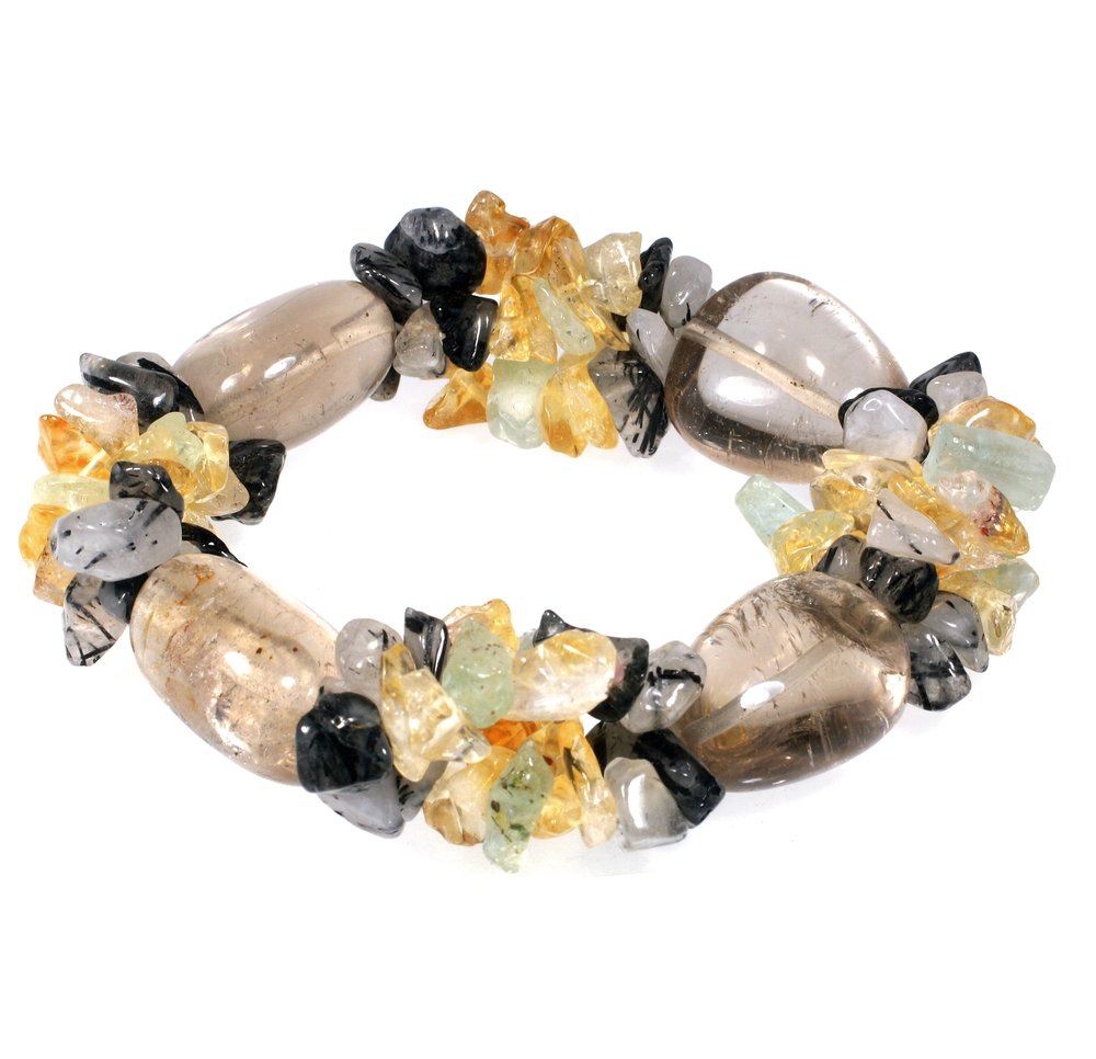 For natural glamour this Smoky Quartz Multi Gemstone Chip Bracelet is the perfect choice. Each of the crystal clusters consists of Aquamarine, Citrine and Tourmalinated Quartz, all with delightfully complimentary colours. The Smoky Quartz tumble stones standout beautifully and the whole bracelet simply shines in the light. It looks great against your skin and is elasticated which means it fits any wrist comfortably.