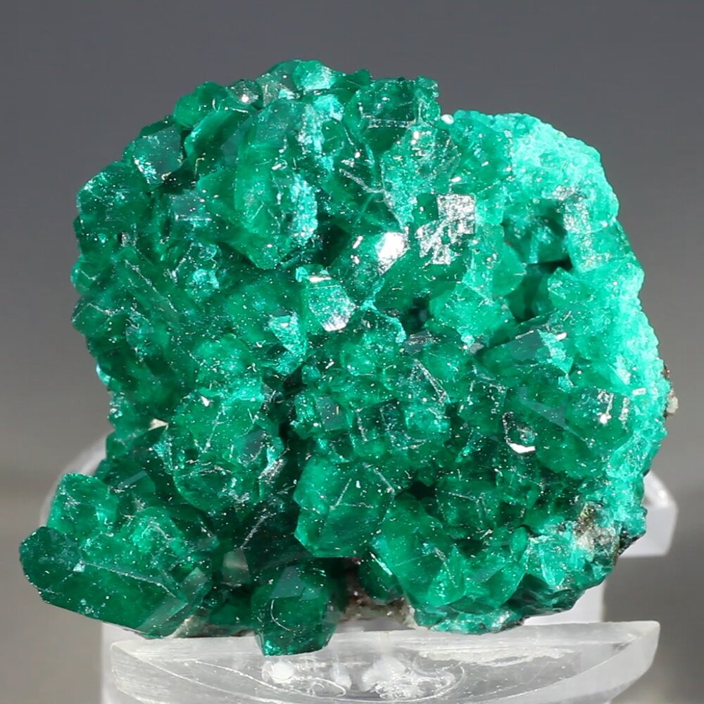 A top quality Dioptase specimen from the famous Tsumeb mine, Tsumeb, Oshikoto region, Namibia. The lustrous crystals display characteristic emerald green colour with well defined crystal edges and faces.